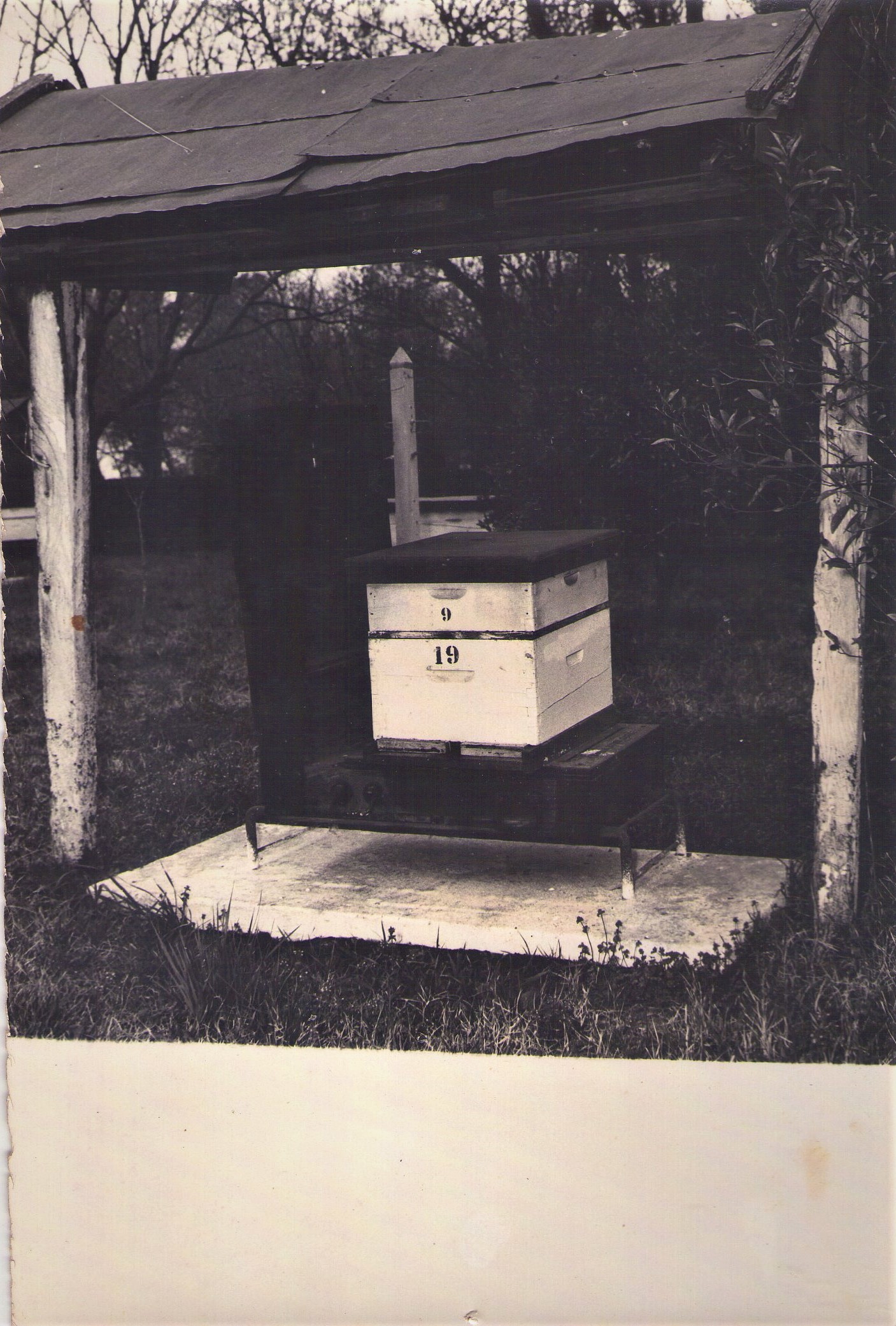 - Apiario Colmena-báscula con guarda piquera, cámara de cría, rejilla excluidora y media alza, bajo el techo que la resguarda de la lluvia.